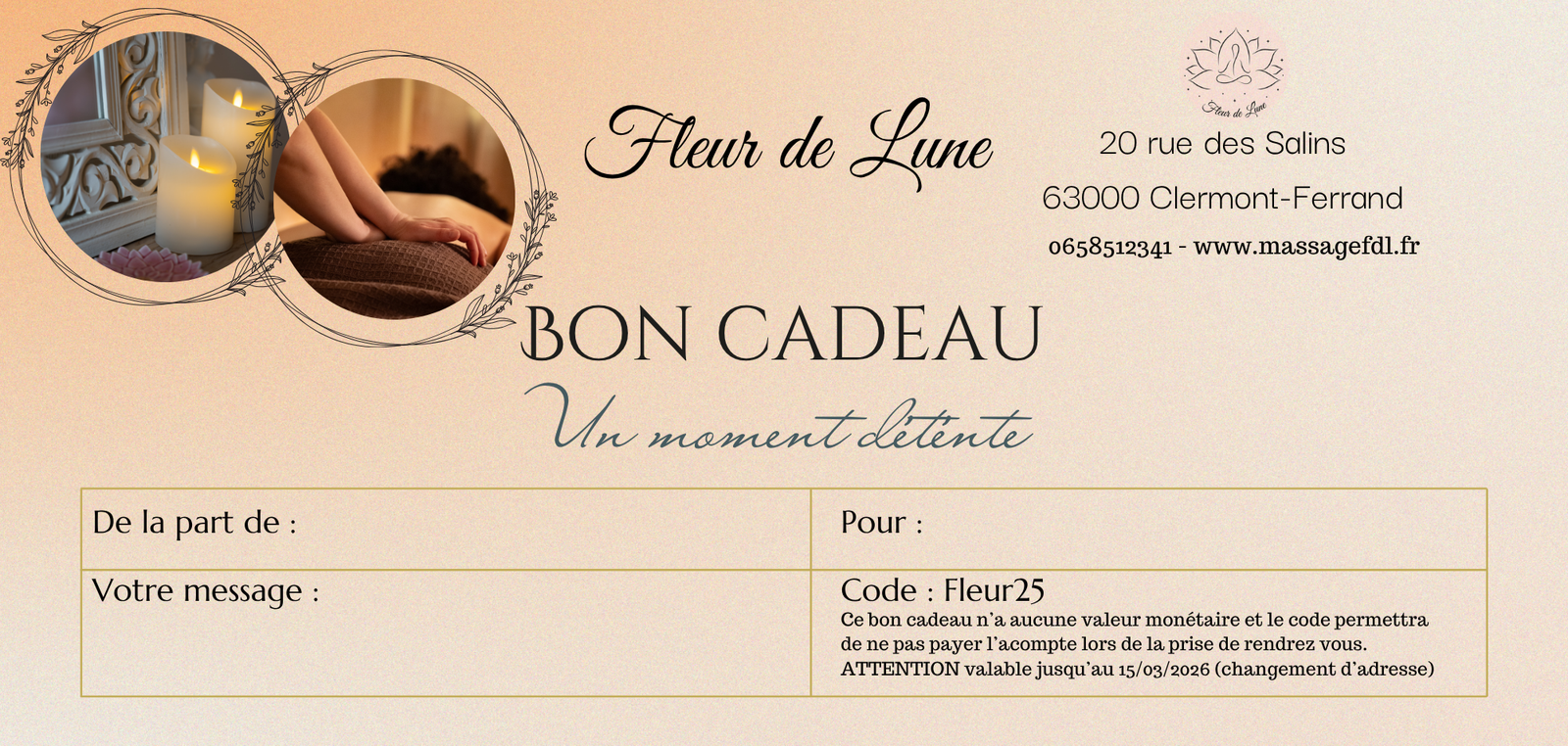 Il vous suffira d’y joindre une enveloppe contenant le montant du massage que vous souhaitez offrir.